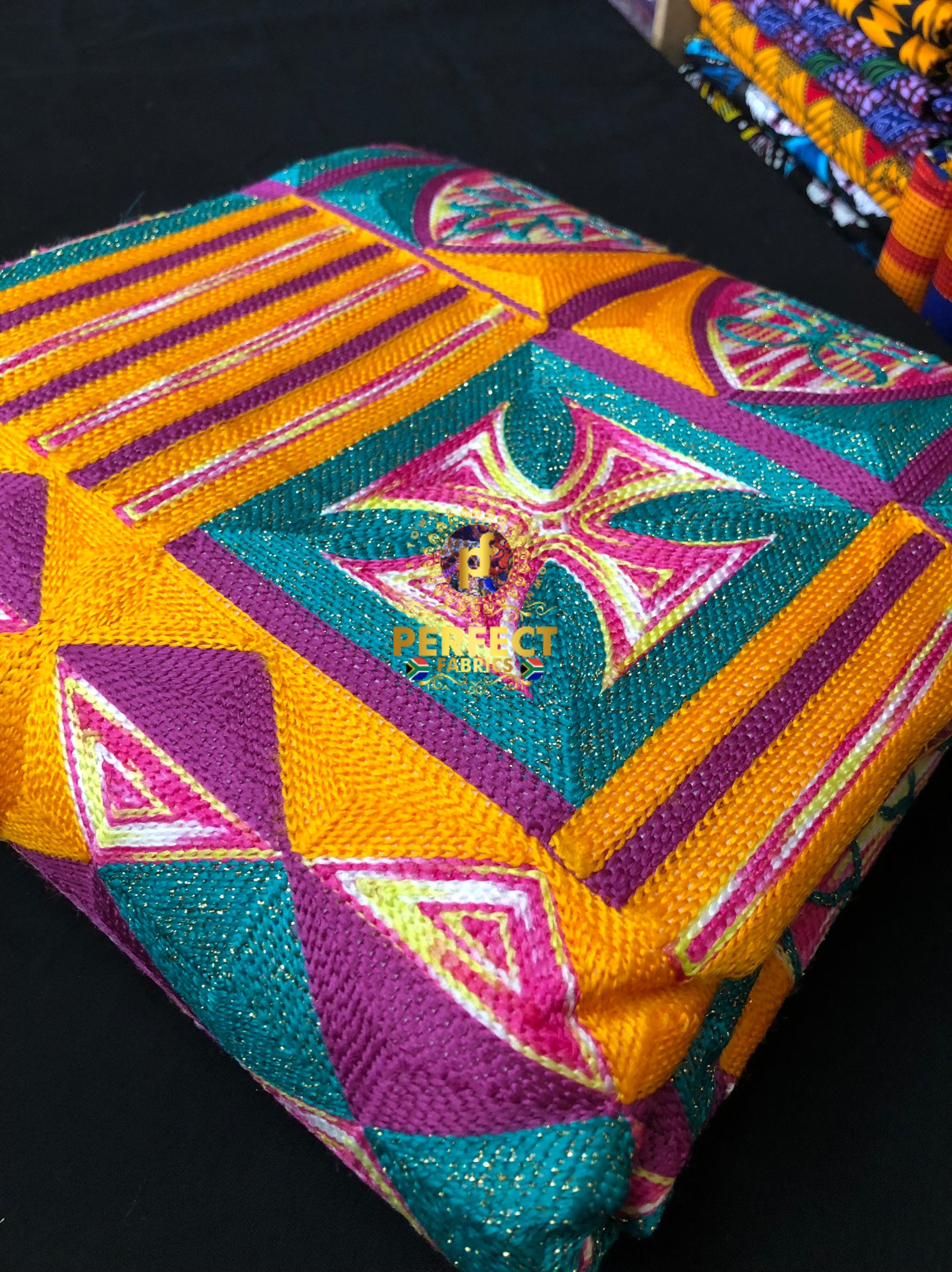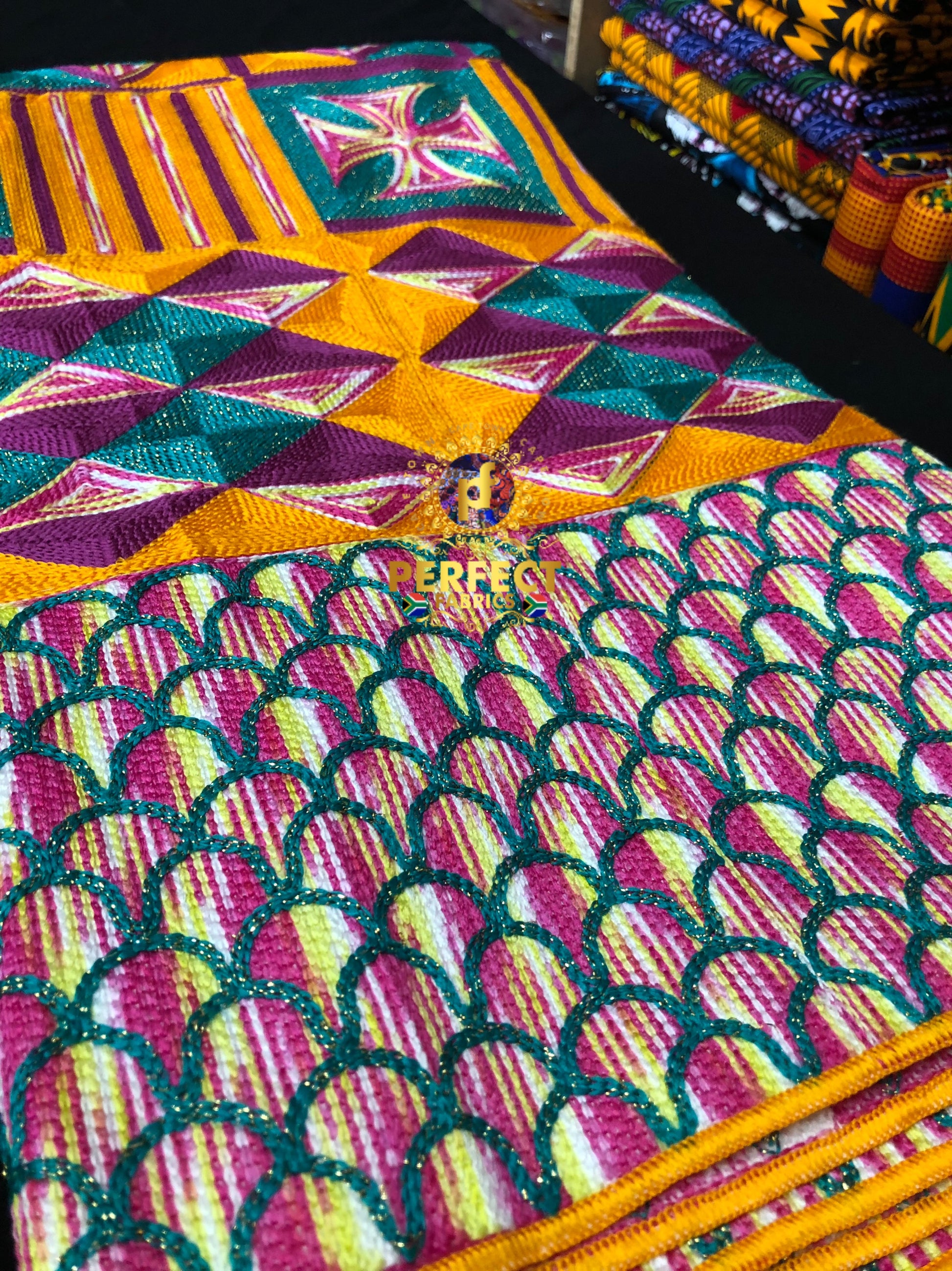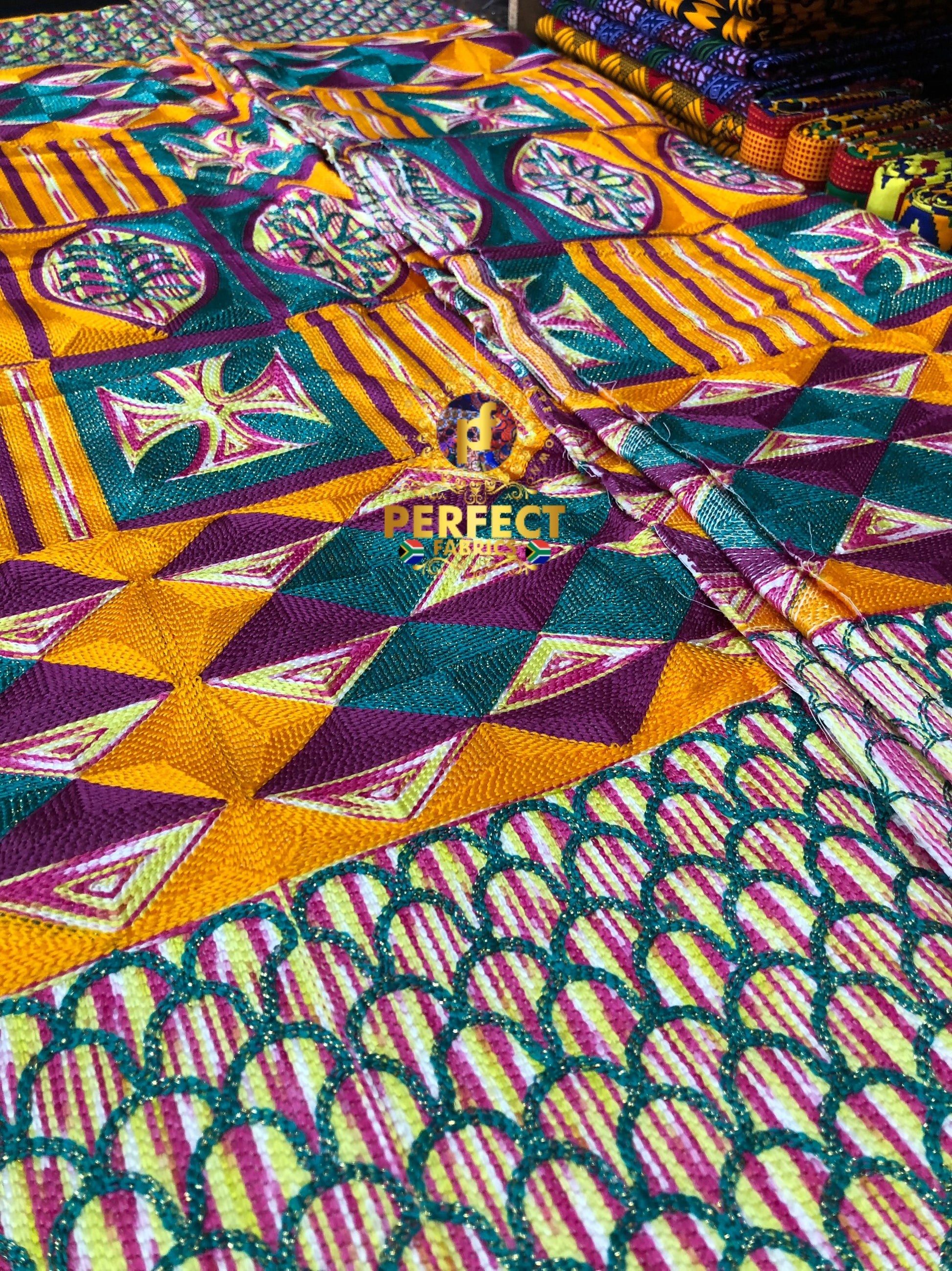 High quality fully embroidered kente pattern on 100% cotton mixed with metallic threads to mimic woven kente.