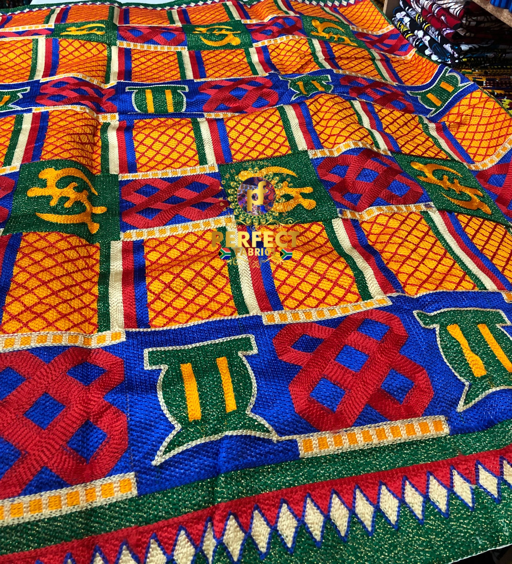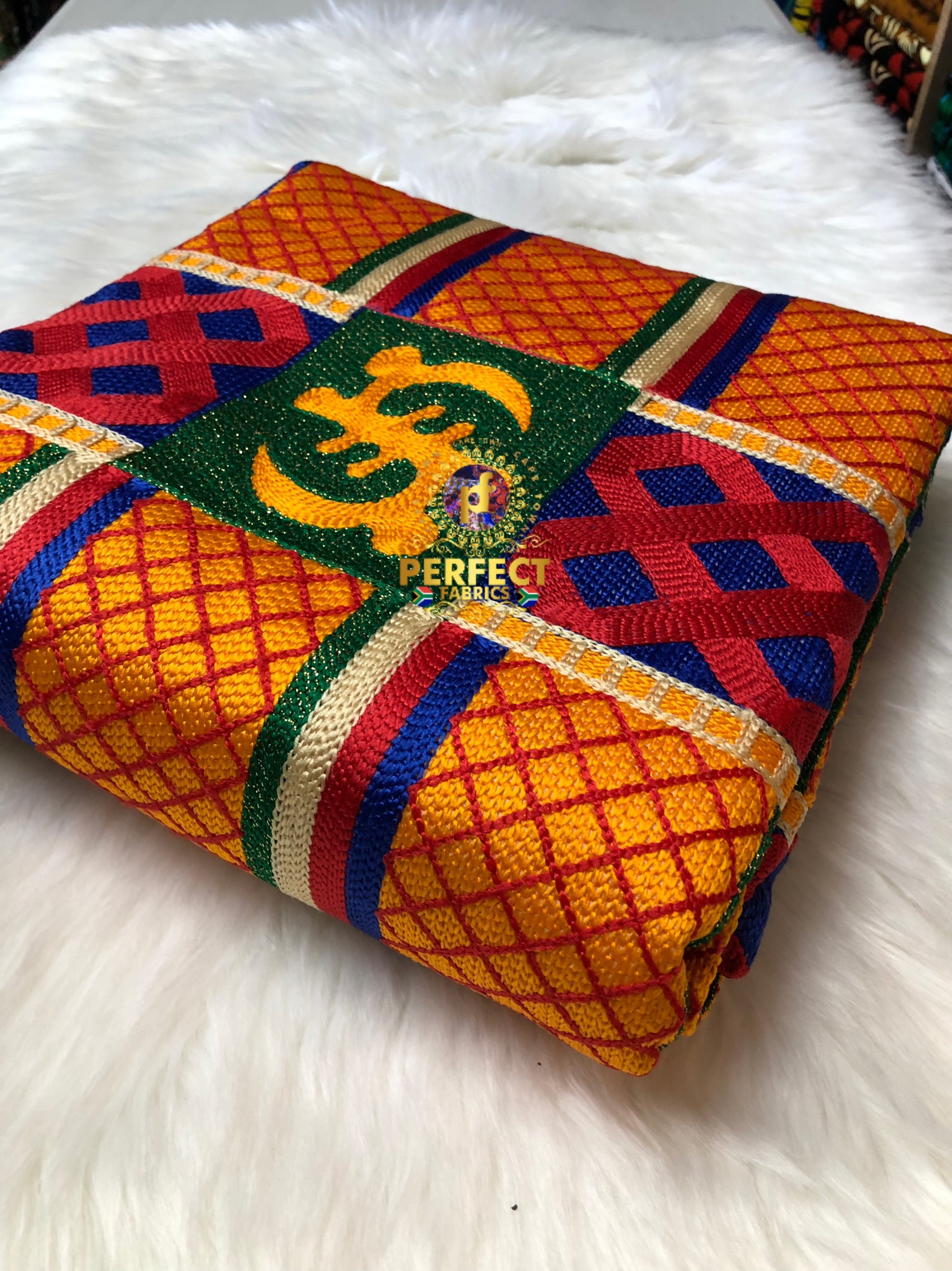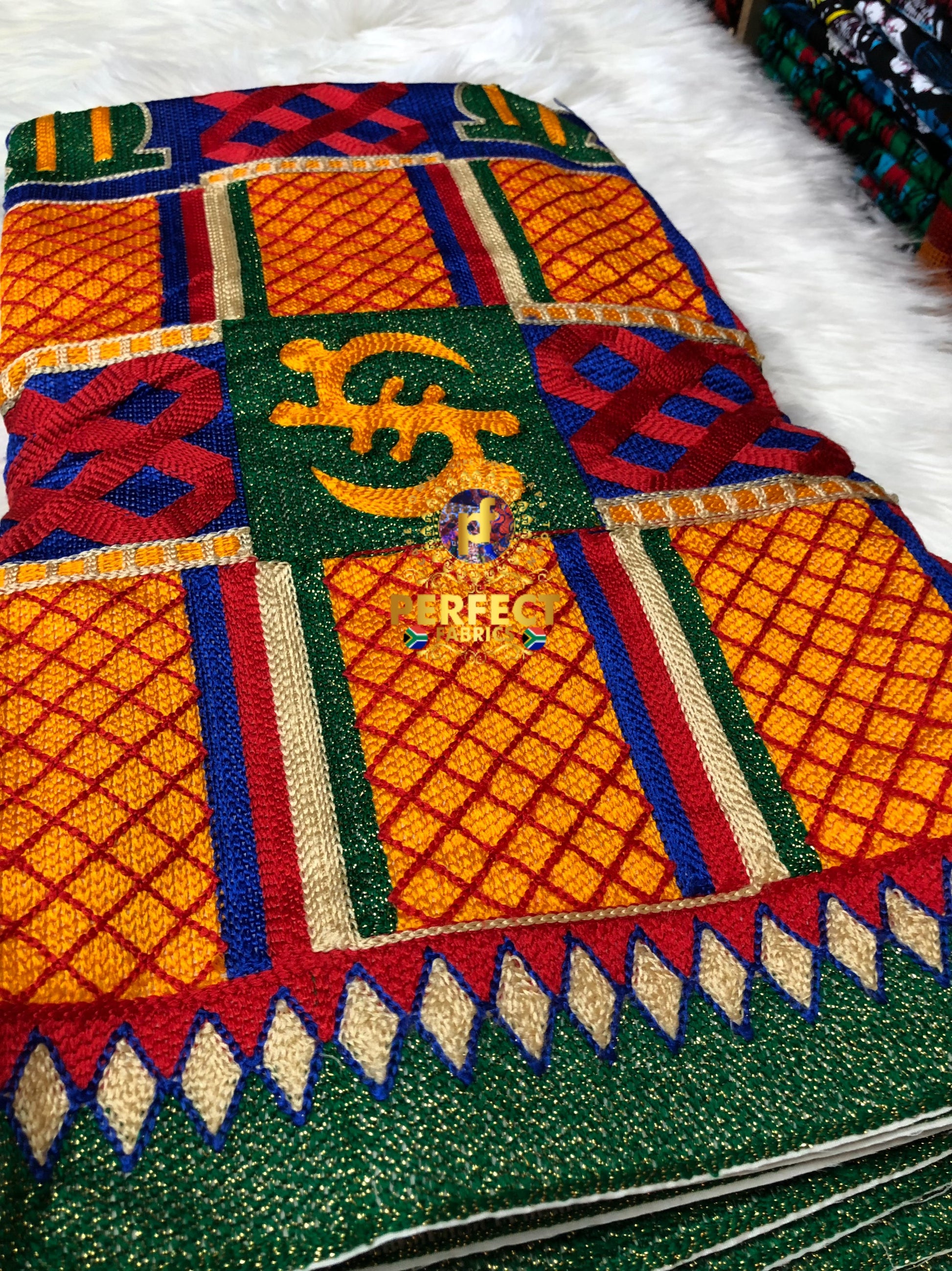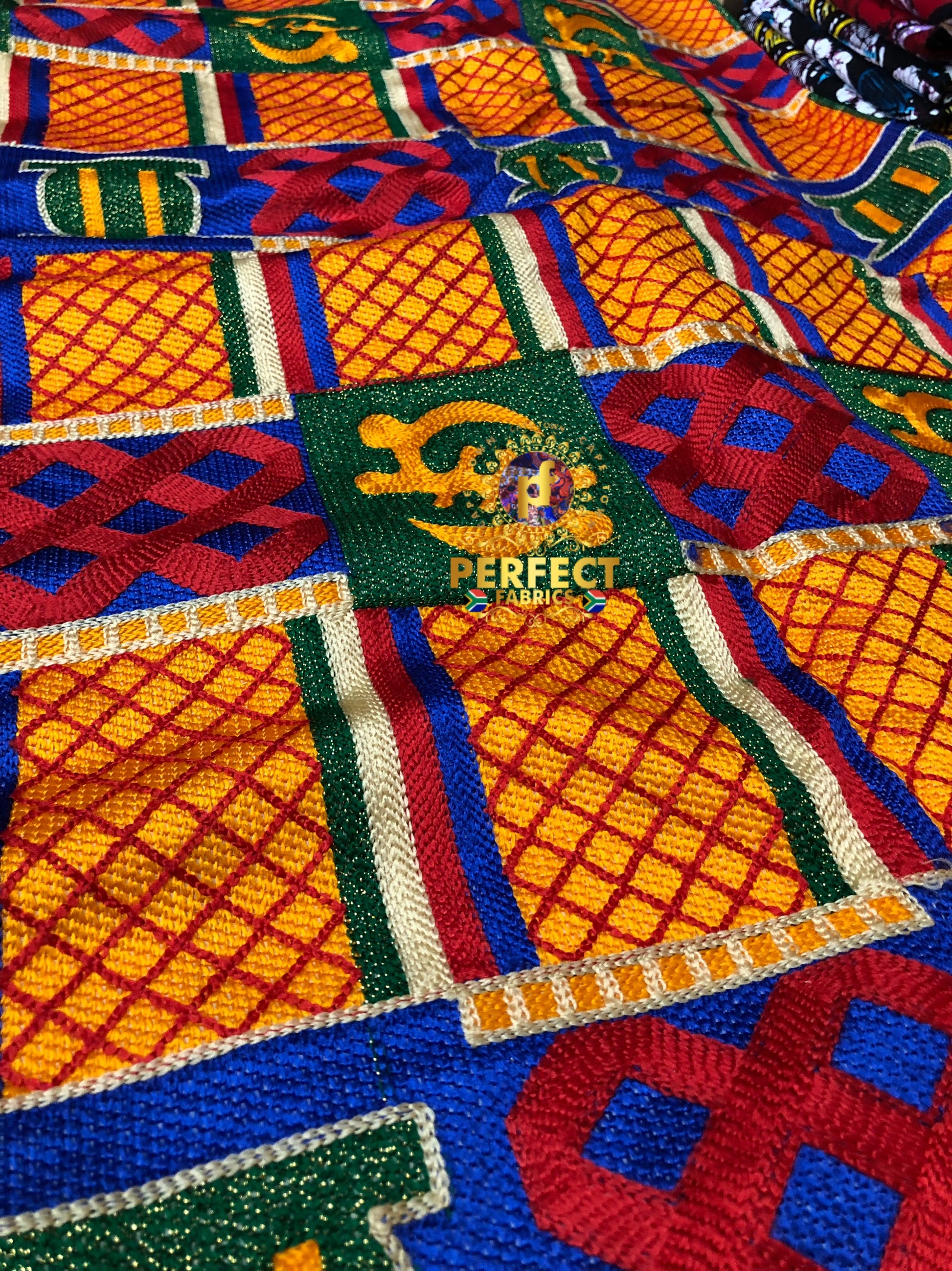 High quality fully embroidered kente pattern on 100% cotton mixed with metallic threads to mimic woven kente.